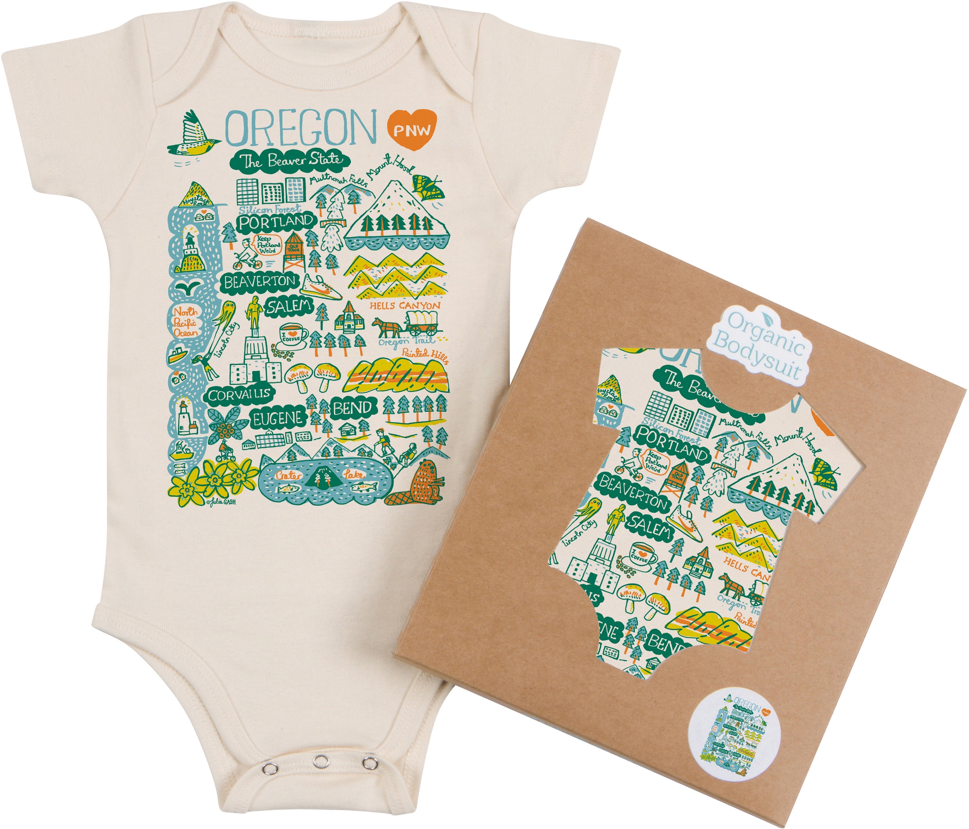 The Oregon Map Baby Bodysuit or Toddler Tee features a fun and colorful design by artist Julia Gash. You’ll find tall trees, lighthouses, coffee cups, and more — all in a playful Oregon map illustration.